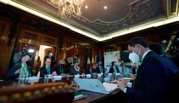 Una reunión a la que también han participado el vicepresidente de la Junta de Andalucía y consejero de Turismo, Regeneración, Justicia y Administración Local, Juan Marín, y el consejero de la Presidencia, Administración Pública e Interior, Elías Bendodo.
