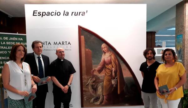 El Espacio “La Rural” alberga hasta el próximo 15 de julio la obra Santa Marta de la iglesia parroquial del mismo nombre, antes de volver a su lugar habitual, en Martos, tras ser restaurada por Gustavo López gracias a la financiación de la Fundación Caja Rural de Jaén. A la presentación del lienzo acudieron Lourdes Martínez, concejal de Martos; Carlos Moreno, párroco de Santa Marta; Gustavo Pérez, autor de la restauración, y el presidente de la Fundación Caja Rural, Luis Jesús García-Lomas.