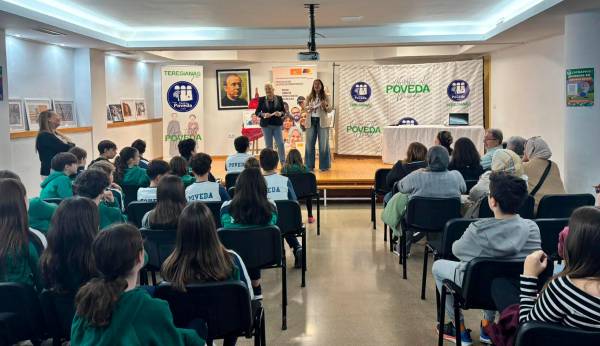A las diez de la mañana, cuando el sol se colaba tamizado entre las cristaleras del edificio, los alumnos del colegio Pedro Poveda de Jaén aguardaban en la planta baja, donde la fotógrafa madrileña Gloria Nistal presentaba su exposición “Sonrisas como bálsamo para un mundo en crisis”. La sala, blanca y diáfana, se había transformado en un pequeño mirador del mundo: Fotografías enmarcadas con sobriedad, apoyadas en una delgada estantería que recorría las paredes como una línea continua de luz y gesto humano. Se trata de un proyecto que llevan a cabo la Asociación de Desarrollo Rural de Sierra Mágina y el proyecto Rajab, dedicado a la “acogida y encuentro con personas inmigrantes” y que ayer tuvo parada en la capital jiennense. Presentó a la escritora, poeta, profesora, fotógrafa y viajera, la dinamizadora cultural de la ADR de Sierra Mágina, Cristina Vico, quien ensalzó la trayectoria de Gloria Nistal, con un currículum en viajes por el llamado Tercer Mundo fuera de lo común, y subrayó, de forma especial cómo “es capaz de transportarnos a cualquier lugar del mundo con una fotografía; lo que estáis viendo aquí- subrayó- son imágenes que ilustran claramente cómo la mirada de Gloria es capaz de captar ese preciso instante que llena de vida una fotografía”. Según Cristina Vico, “otro mundo es posible si nos centramos en lo importante de la vida, la sonrisa, la alegría de los seres humanos, vivan donde vivan”. Presentes también en el acto, la directora del Colegio Pedro Poveda de Jaén, Marta Cruz, junto con la coordinadora del Proyecto Rajab, Pilar Poveda, así como la directora pedagógica de Infantil y Primaria, Pilar Almagro. Tras las palabras de bienvenida, la fotógrafa agradeció la invitación y compartió brevemente la emoción que le producía exponer en un entorno educativo antes de dar paso a la contemplación de las imágenes en una charla interactiva con los alumnos.