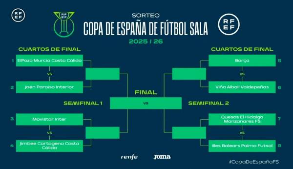 El Jaén Paraíso Interior ya sabe su camino en la Copa de España, trofeo que ha ganado en tres ocasiones: 2015, 2018 y 2023. Los amarillos disputarán el partido inaugural en Granada, el 19 de marzo, contra ElPozo de Murcia, el campeón de la primera vuelta y actual líder del torneo. Los dos conjuntos se conocen a la perfección y será la cuarta vez que coincidan en el torneo, con dos victorias amarillas, en 2015 y 2023, y una derrota polémica en 2024. En caso de ganar el conjunto que entrena Daniel Rodríguez se enfrentaría al vencedor del cruce Movistar-Jimbee Cartagena en las semifinales del día 21 de marzo. Los emparejamientos por el otro lado del cuadro son Barça-Viña Albali FS y Quesos El Hidalgo Manzanares-Illes Balears Palma Futsal, que se disputarán el día 20.