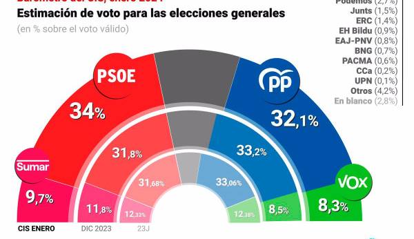 El barómetro del mes de enero da una estimación de voto récord al PSOE del 34% y el PP cae casi un punto con el 32,1%