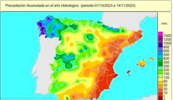 El valor medio de lluvias acumuladas desde que comenzó este año hidrológico, el 1 de octubre, hasta el 14 de noviembre de 2023 se sitúa en un 30 por ciento (%) por encima del valor normal para este periodo. No obstante, el superávit de precipitaciones se ha reducido esta semana en 13 puntos respecto a la semana anterior, cuando alcanzaba el 43 por ciento por encima del valor climatológico, según ha informado la Agencia Estatal de Meteorología (Aemet). Meteorología señala que hasta esta fecha se ha acumulado una media de precipitación para el conjunto de España de 146 litros por metro cuadrado, cuando lo normal en este periodo de referencia son 112 litros por metro cuadrado. De este modo, las precipitaciones superan las cifras habituales para el período comprendido entre 1991 y 2020 en gran parte de la mitad oeste peninsular, en la mitad más occidental del Pirineo y en el norte de las Islas Canarias.