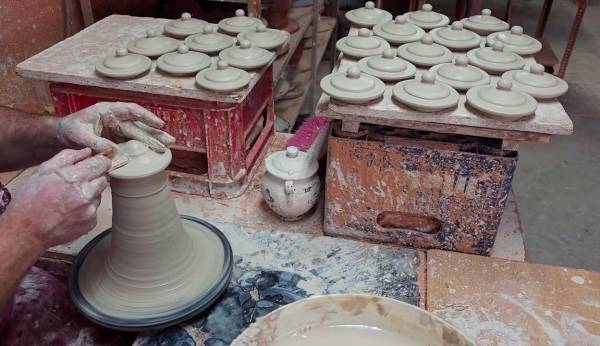 Alfar en La Campiña jiennense. Rueda y rueda el torno mientras el alfarero modela con sus manos expertas un bloque de buena arcilla del que salen, una a una, las tapas para los azucareros con precisión cirujana. Fabricarlas requiere mucho oficio y talento. A la par, la máquina, incorporada al oficio artesano milenario, produce piezas básicas con pequeños bloques de barro. En las estanterías se apilan las piezas terminadas. Un ajuar completo para la cocina: vasos, tazas, platos, azucareros, saleros, pequeñas bandejas, jarras y cuencos. Diseños sencillos, clásicos; algunos figurativos, todos coloristas y dignos para la mejor gastronomía.