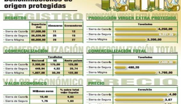 Por último, la Denominación de Origen Protegida Sierra de Segura dispone de 36.529 hectáreas, de las que obtuvo 6.221 toneladas de aceite certificado. 449 las vendió dentro de España, mientras que 4,52 salieron a países de la Unión y 25,74 a otros destinos, lo que conllevó la venta de 480 toneladas a un valor medio de 3,67 euros por kilo. Logró 1,76 millones de euros y el 1,63% de las ingresos por la comercialización de zumo de aceituna certificado en España.