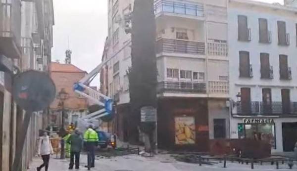 Intervención en el ciprés de la calle Martínez de Molina, en el centro de la ciudad, por peligro de caída. Ante las fuertes rachas de viento, se ha procedido al corte del árbol como medida preventiva.