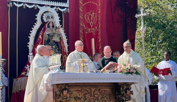 El flujo de pasos y devotos hacia Virgen de la Cabeza fue incesante. Allí, en el corazón del dispositivo, se levantó el altar donde a mediodía se celebró la misa de campaña, presidida por la Virgen del Rosario, titular de la Hermandad de la Amargura, que fue trasladada desde su casa de hermandad para ocupar el lugar central del acto litúrgico. La afluencia de público y los inevitables ajustes en los traslados provocaron un retraso de media hora sobre el horario previsto, iniciándose la eucaristía pasadas las 12:30 horas.