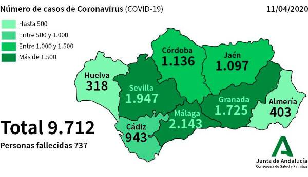 La Consejería Salud y Familias informa que se han confirmado en Andalucía 202 nuevos casos de coronavirus en las últimas horas. Así, el número total de afectados en Andalucía asciende a 9.712. Actualmente, 1.762 pacientes confirmados con covid-19 permanecen ingresados en los hospitales andaluces, de los que 381 se encuentran en UCI. Lo que supone un importante descenso en el número de hospitalizaciones convencionales e ingresos en las Unidades de Cuidados Intensivos.