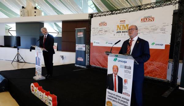 En un acto conducido por el director de Diario JAÉN, Juan Espejo, la primera intervención corrió a cargo del director territorial de Andalucía Oriental de Unicaja Banco, Juan Cayuela, como patrocinador de esta edición de los encuentros informativos de Diario JAÉN. Cayuela mostró su agradecimiento por ello y remarcó el significado que implica este compromiso: “Para Unicaja estar aquí tiene un significado especial. Somos una entidad arraigada en esta tierra, que es Jaén, y convencida de que el progreso económico debe ir siempre acompañado del progreso social. Por eso participamos en foros que invitan a pensar y compartir ideas”. Cayuela también insistió en su apuesta por la sostenibilidad: “Desde una visión de largo plazo que busca generar valor entre nuestros clientes”. Y aquí lanzó su ejemplo hablando de Edad Dorada - Mensajeros de la Paz: “Su trayectoria, especialmente con las personas mayores, es ampliamente reconocida. Su trabajo es una muestra de solidaridad compartida, que requiere coordinación entre administraciones, entidades sociales, empresas y ciudadanos”. Y se dirigió a Julio Millán Medina: “La labor que desarrolla usted y su equipo zona son admirables y es un claro ejemplo de la labor que realiza”.