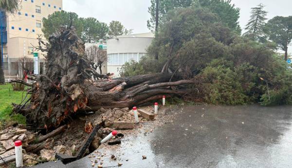 Continúan las incidencias en la capital. Las fuertes rachas de viento echan abajo al menos tres árboles del recinto del Hospital Neurotraumatológico de Jaén. Tal y como ha podido confirmar este periódico, los bomberos ya se encuentran en las instalaciones sanitarias para resolver las incidencias. Además de árboles, el viento también ha derribado señalizaciones verticales.