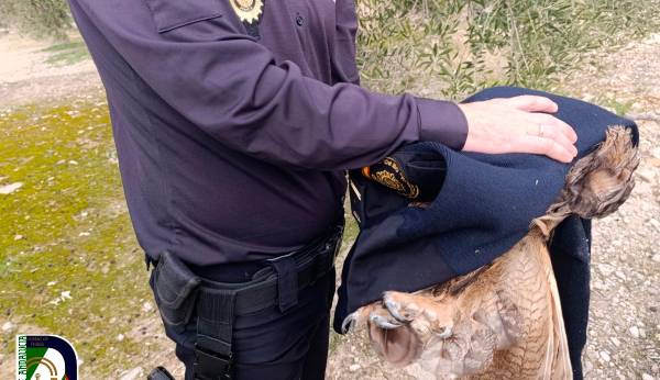 Un ejemplar de búho real ha sido rescatado este fin de semana en el paraje de La Cruz, tras aparecer herido junto a la carretera. Según señalan desde la Policía Nacional adscrita a la Junta de Andalucía, podría haber sido afectado por un choque con un vehículo. La rápida intervención de los efectivos permitió asegurar al ave y ponerla a salvo, evitando que su estado empeorara o que volviera a correr peligro en la vía. El animal fue trasladado para recibir atención especializada, con el objetivo de lograr su recuperación completa. El búho real, una de las rapaces nocturnas más emblemáticas de la Península Ibérica, se encuentra ahora en proceso de recuperación con la esperanza de que pueda volver pronto a volar en libertad.