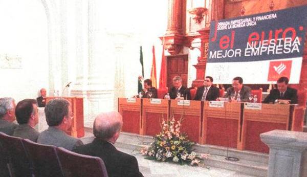 Tal y como publicó este periódico hace veintiocho años, el 10 de marzo de 1998, la Jornada Empresarial y Financiera sobre la Moneda Única que organizaron la Confederación de Empresarios de Jaén (CEJ) y CajaSur sobre el euro contó con una masiva respuesta por parte de los empresarios de la provincia, pues abarrotaron el salón de actos del Hospital de San Juan de Dios. Diego Torres, el entonces presidente de la CEJ, fue el encargado de abrir el acto, que enmarcó dentro del compromiso de la patronal jiennense en prestar servicios a las empresas. La clausura corrió a cargo de Rafael Alvarez Colunga, entonces presidente de la Confederación de Empresarios de Andalucía (CEA), y Luis Alberto Valero, el entonces director general de CajaSur. No obstante, el núcleo central del acto consistió en sendas conferencias a cargo de Juan Iranzo, el que era director del Instituto de Estudios Económicos (lEE), y Emilio Ontiveros, el entonces consejero delegado de Analistas Financieros Internacionales y coautor, junto a Francisco J. Valero, de “La Guía del Euro”, una publicación editada por CajaSur y que se repartió entre todos los asistentes al acto.