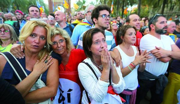 Las cerca de 30.000 personas concentradas en el paseo Lluís Companys de Barcelona, cerca del Parlament, con motivo de la declaración del presidente del Govern, Carles Puigdemont, estallaron de alegría cuando el presidente de la Generalitat, Carles Puigdemont, asumió que Cataluña sea independiente, pero este júbilo se tornó en silencio y silbidos cuando el jefe del Ejecutivo catalán manifestó que quedaba en suspenso. Las personas concentradas siguieron en silencio el discurso, en medio de aplausos en momentos clave como cuando se recordó a los heridos el 1-O, para estallar de júbilo cuando Puigdemont afirmó que asumía el mandato de que Cataluña sea un estado independiente en forma de república.