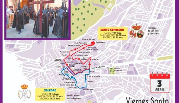 El Santo Sepulcro partirá desde la Iglesia de San Juan y San Pedro a las 19 horas, junto a los pasos del Calvario y Nuestro Señora de los Dolores. Recorrerán la Plaza de San Juan, calle Martínez Molina, Plaza de la Audiencia, Colón, Álamos, Doctor Civera, San Clemente, Plaza de los Jardinillos y Madre Soledad Torres Acosta para iniciar su itinerario por la carrera oficial a las 21.20 horas. El encierro tendrá lugar a partir de las 23:50 horas.