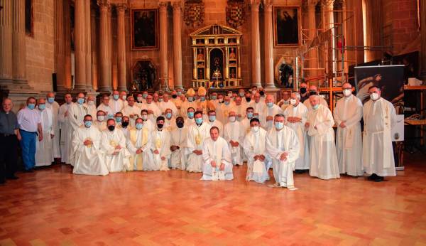 Al finalizar la Eucaristía, después de impartir la bendición con el Santo Rostro, el casi centenar de sacerdotes diocesanos que han concelebrado esperaban, con un efusivo aplauso, la llegada de Don Ramón a la Sacristía, donde ha tenido oportunidad de saludarlos y conversar con ellos.