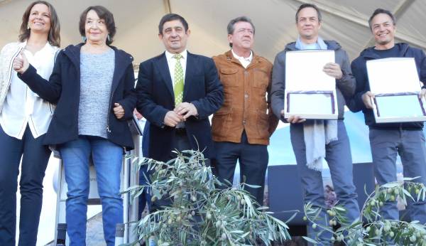 Sobre el escenario, que corona también durante la jornada de hoy la plaza de Santa María, los hermanos Torres recibieron, de manos de los diferentes representantes institucionales, dos placas que los acreditan como embajadores de honor de esta edición de la Fiesta Anual del Primer Aceite. Además, entregaron a Petra Martínez un lote con algunas botellas del mejor aceite de la provincia.