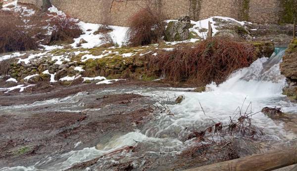 <i>El manantial segureño cubierto por un manto de nieve, pero sin agua, a 24 de enero de 2026.</i>