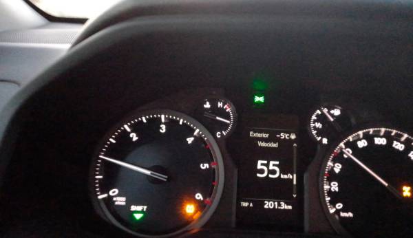 Consola del vehículo que marca -5º justo arriba del marcador de velocidad. / Twitter Infoca.