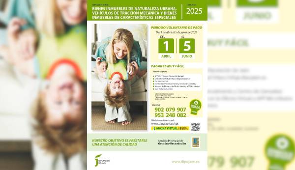 La Diputación de Jaén acaba de abrir el plazo para que la ciudadanía pueda abonar el Impuesto de Bienes Inmuebles de Naturaleza Urbana (IBU), el de Bienes Inmuebles de Características Especiales (Bices) y el de Vehículos de Tracción Mecánica (IVTM), poniendo de esta forma en marcha el primer periodo de la campaña de recaudación voluntaria de 2025, que se prolongará hasta el próximo 5 de junio. Más de 740.000 recibos, que suman un importe superior a los 120 millones de euros, se han puesto al cobro en los 93 ayuntamientos de la provincia —todos excepto Jaén capital, Martos, Úbeda y Villanueva del Arzobispo— que tienen delegada a la Administración provincial la gestión de estos tributos locales.