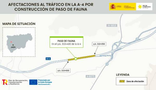 Durante dichas afectaciones se llevarán a cabo los trabajos necesarios para la construcción de un paso inferior bajo la autovia A-4 en el kilómetro 310,4 mediante excavación de las calzadas, colocación de marcos prefabricados, posterior reconstrucción de los terraplenes de la autovía y del firme, así como señalización y demás elementos funcionales afectados. Las obras de mejora de la seguridad vial en relación con fauna en la provincia de Jaén (en las autovias A-4, A-32 y A-44, y en la carretera N-323) cuentan en su totalidad cuenta con un presupuesto vigente de 15.495.292 euros (IVA incluido). De ellos, 731.480 euros se destinarán a este paso inferior en la A-4, que tiene por objeto favorecer el paso de fauna existente en la zona a través de la autovía, favoreciendo la permeabilidad de la infraestructura, evitando atropellos de animales y mejorando la seguridad vial.