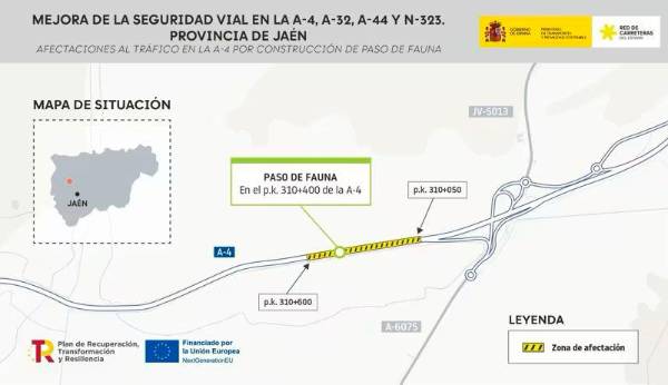 El tráfico en la autovía A-4 a su paso por la provincia de Jaén se verá afectado desde hoy por obras para la implantación de un paso para fauna. En concreto, se ejecutará en el kilómetro 310,4 con el objetivo de favorecer la permeabilidad de la infraestructura viaria evitará atropellos de animales y contribuirá a mejorar la seguridad vial. Así lo ha indicado este lunes en una nota el Ministerio de Transportes y Movilidad Sostenible, desde el que se continúa ejecutando las obras de mejora de la seguridad vial en relación con la fauna tanto en la A-4 como en las autovías A-32 y A-44, y en la carretera N-323, en la provincia jiennense. Estas actuaciones cuentan con un presupuesto total de 15,5 millones de euros (IVA incluido), financiado con cargo a los fondos europeos del Plan de Recuperación, Transformación y Resiliencia. En el caso del citado paso en la A-4, el Ministerio ha explicado que su ejecución hace “necesario el corte de la calzada con sentido Sevilla” a partir de las 8:00 horas de este martes 7 de abril “y hasta, previsiblemente, el viernes 29 de mayo”. El tráfico se desviará mediante desvíos provisionales a la calzada opuesta, sentido Madrid, donde se habilitará la circulación en ambos sentidos. Estos desvíos se situarán entre los kilómetros 310,05 y 310,6 de la A-4.