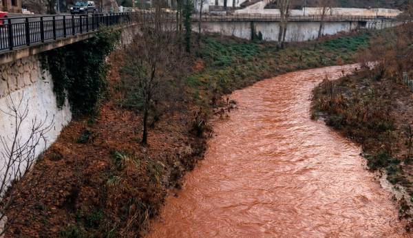 No llueve, primer día de sol para la comarca de la Sierra de Segura y bajada de los caudales de los ríos. Así está esta mañana el río Guadalimar, con sus habituales aguas rojas, por la localidad de La Puerta de Segura. Baja con fuerza y con imperante caudal pese a que aguas arriba se encuentra el embalse de Siles.