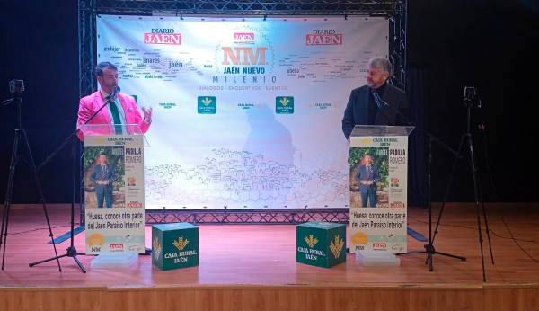 El alcalde de Huesa, Ángel Padilla Romero, ha participado este miércoles en otra edición de los diálogos ‘Jaén Nuevo Milenio’, que organiza Diario JAÉN con el patrocinio de Caja Rural de Jaén. La cita se ha celebrado en el salón de actos de la Casa de la Cultura. Ángel Padilla ha puesto el acento en la diversificación de la economía local y ha sido presentado por Francisco Javier Martínez Luque, médico de la Fundación Proyecto Hombre de Jaén y secretario general del Sindicato Médico de Jaén. Durante su conferencia, titulada ‘Huesa, conoce otra parte del Jaén Paraíso Interior’ ha hecho referencia a los recursos y atractivos que tiene el municipio y su posibilidades para no dependen exclusivamente del monocultivo del olivar. El alcalde, en este sentido, ha destacado la producción de carne avícola, el turismo, el deporte al aire libre, ¡también el aceite de oliva y, sobre todo, la calidad de las gentes de este pueblo como claves para potenciar la economía local. Asimismo, hecho mención al Cerro Negro y el olivar de Brazo Fuerte Villae de la época romana y de otros vestigios que dejaron pobladores asentados a lo largo de la historia en el municipio. Tras su intervención ha respondido a las preguntas que le ha trasladado el director de Diario JAÉN, Juan Espejo.