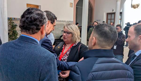 Estela Palacios tiene un fugaz encuentro con el presidente de la Junta de Andalucía en el que traslada la situación insostenible del municipio: carriles cortados, sin luz y sin cobertura