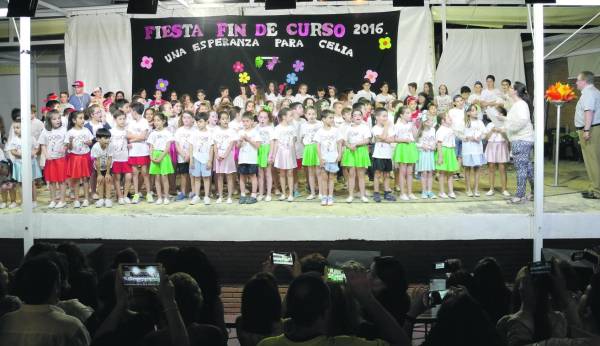 El colegio Santiago Apóstol de Valdepeñas organizó la tradicional fiesta de fin de curso, en la que congregó a un millar de personas en la Caseta Municipal. El público pudo disfrutar de coreografías de todo tipo, en la que destacaron las que realizaron varios cursos de Primaria; además de la entrega de orlas, trofeos deportivos y diplomas, a los que concluyen una etapa educativa. En esta ocasión, la nota emocional y solidaria la puso la iniciativa “Una Esperanza para Celia”, con la realización de una rifa solidaria, con el objetivo de recaudar fondos para la investigación sobre la enfermedad de esta niña que, junto a su familia, estuvo presente en el acto y agradeció su solidaridad a los valdepeñeros, sin poder ocultar su gran emoción.