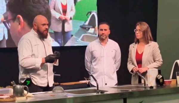 Sierra Mágina demuestra su potencial culinario en la Feria de los Pueblos mediante un “showcooking” (demostración culinaria en directo) con productos de la comarca. Lo ha llevado a cargo Alberto Fernández, propietario de Casa Herminia (Cabra del Santo Cristo); Patxi Marín, propietario de TraBesía Espacio Gastronómico (Huelma); y el ganadero Chus Marín, CEO de la Explotación Ganadera Marín. Junto a ellos ha estado África Colomo, diputada provincial de Cultura y Deportes de la Diputación de Jaén.