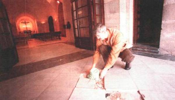 El guarda de la Catedral levanta las baldosas para mostrar los desperfectos ocasionados. / Agustín Muñoz / Archivo histórico del Diario JAÉN.