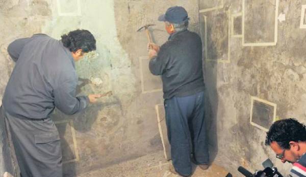 La notaria de Huelma, Elena Ramos González, auxiliada por dos empleados de su despacho, se limitó a comprobar que antes de que comenzaran a picar la pared los albañiles, había imágenes en la superficie, y que después de la intervención, la habitación quedó cerrada a cal y canto.
